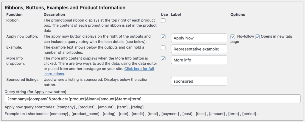 These are the labels and content of each output column. They use the listed shortcodes to get the data from the data. You can then add symbols and currencies where required. Leave the label blank if you don’t want to use a column.
