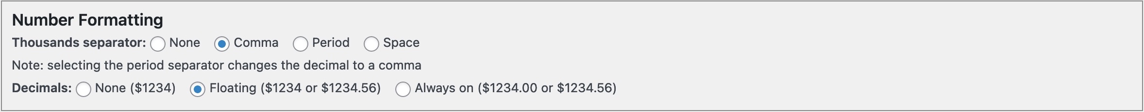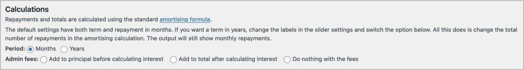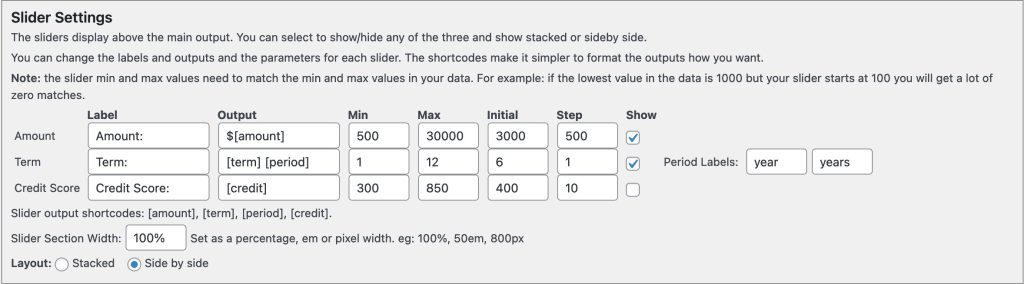 This is where you set the slider values and labels. The output is set using shortcodes so you can change currencies and format. Note the option to change how the sliders are displayed: inline or stacked.