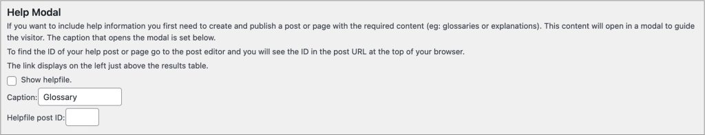 A fairly rudimentary help system. You click on the button and modal displays with all the help you want to show. The contents of the modal are pulled from a page or post on your site. So you need to enter the post ID in the box.